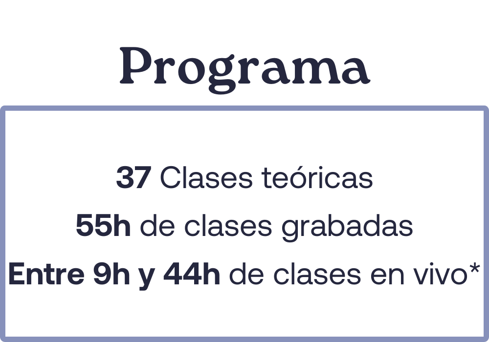 | Sesiones / horas teóricas | 54 h de clases grabadas | 57 h grabadas + 52 h en vivo |